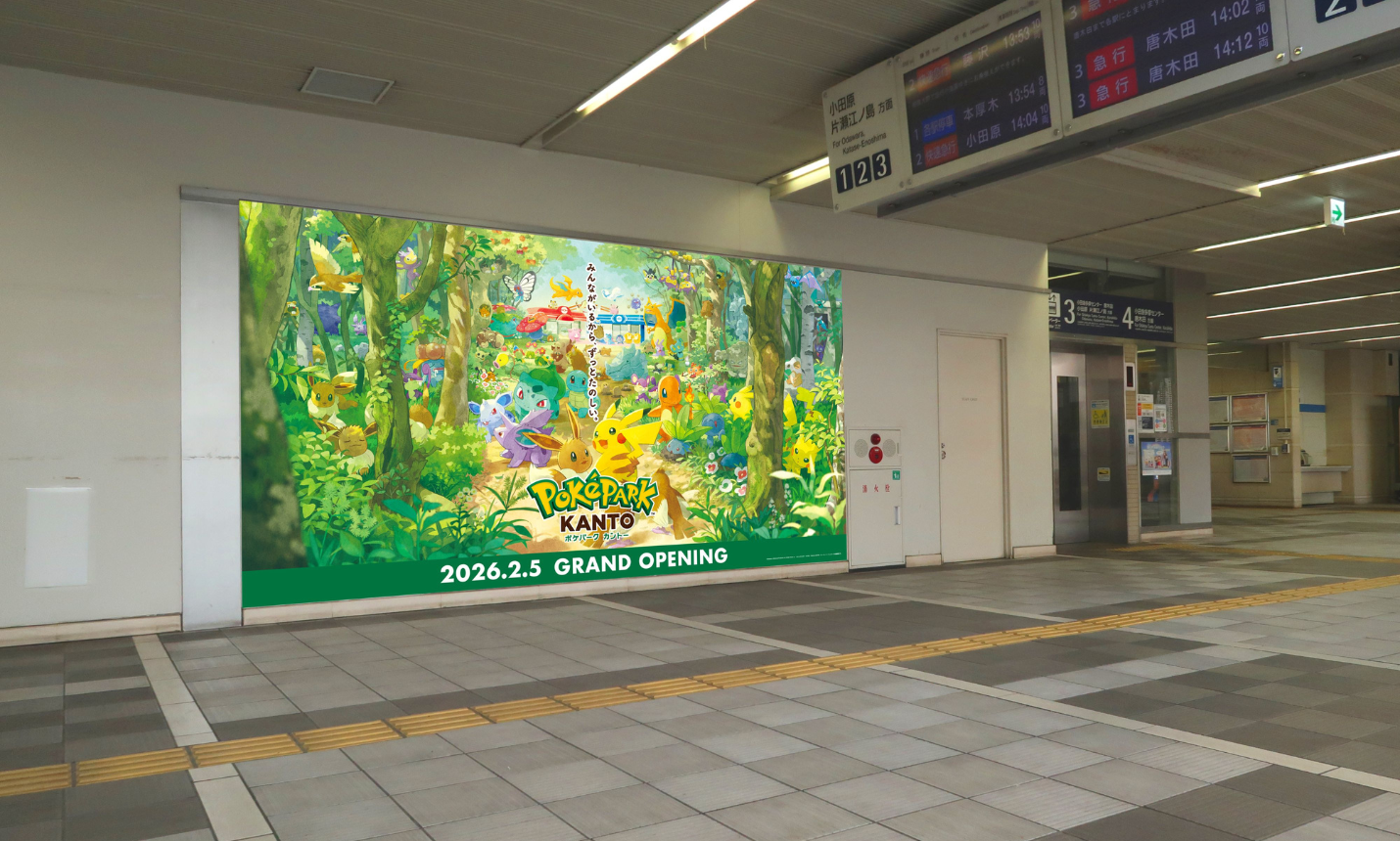 新百合ヶ丘駅では、森の中から「ピカチュウ」と「イーブイ」がこちらを見つめるキービジュアル(幅約4m、高さ約2m)を2カ所に設置。