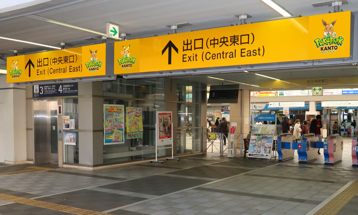 南口改札内の壁面上部と出口案内板に、キービジュアル(幅約4m、高さ約2m)やピカチュウとイーブイのイラストを装飾します