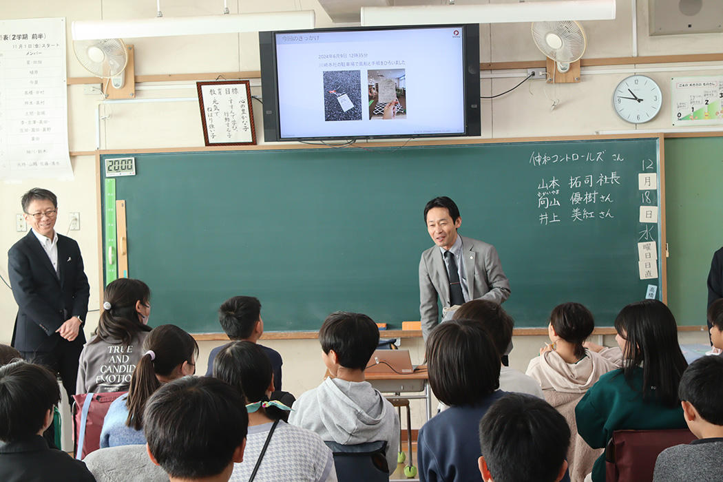 その後、2024年12月18日、山本拓司社長と社員の向山優樹さん、井上美紅さんが谷戸小学校を訪問し、特別授業を行うことに。授業では、2022年に創立60周年を迎えた伸和コントロールズの歴史や、同社が手掛ける半導体製造用チラーなどに関する説明が行われました。